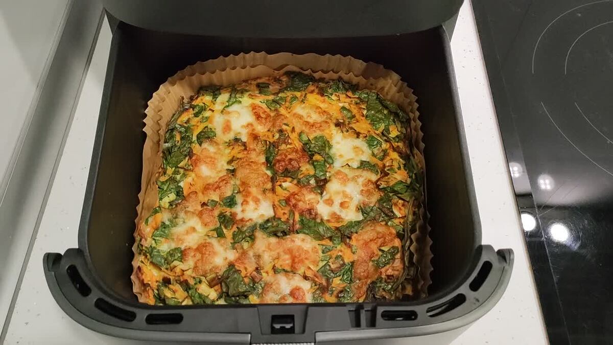 - Pizza con verduras: Lo hice dos veces; la primera, no salió como quería. La segunda fue mucho mejor. ¿La clave? Batir la mezcla de ingredientes en un bol, no en la freidora.