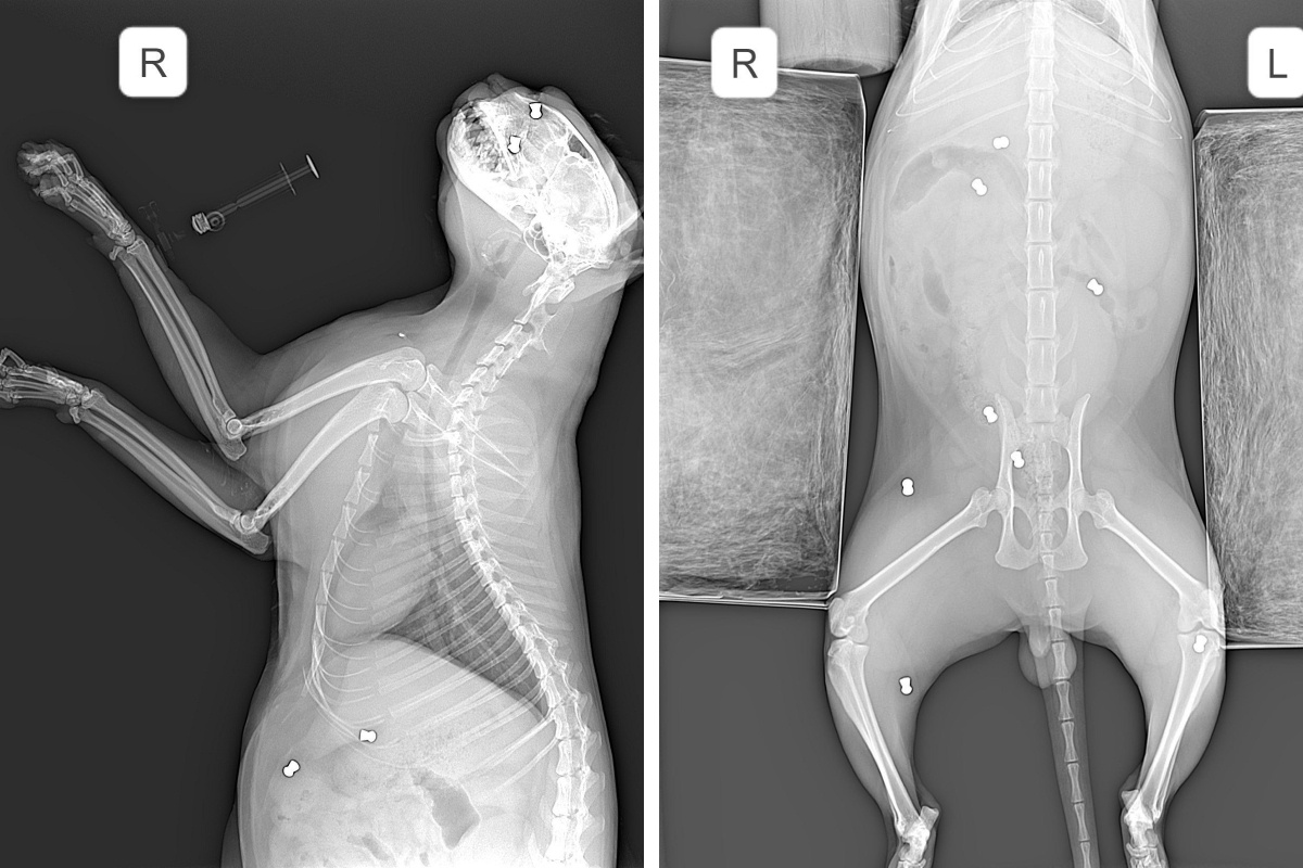 Питомца сразу отвезли в ветклинику, где его обследовали и сделали рентген. Судя по снимку, в теле и голове животного около девяти пуль. Некоторые из них, например около глаза, видны даже без рентгена.