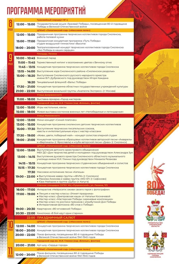В честь 80-летия Победы в Великой Отечественной войне с 8 по 11 мая по всей Смоленской области запланированы праздничные мероприятия. В Смоленске также подготовлена содержательная программа: все события собраны в афише.