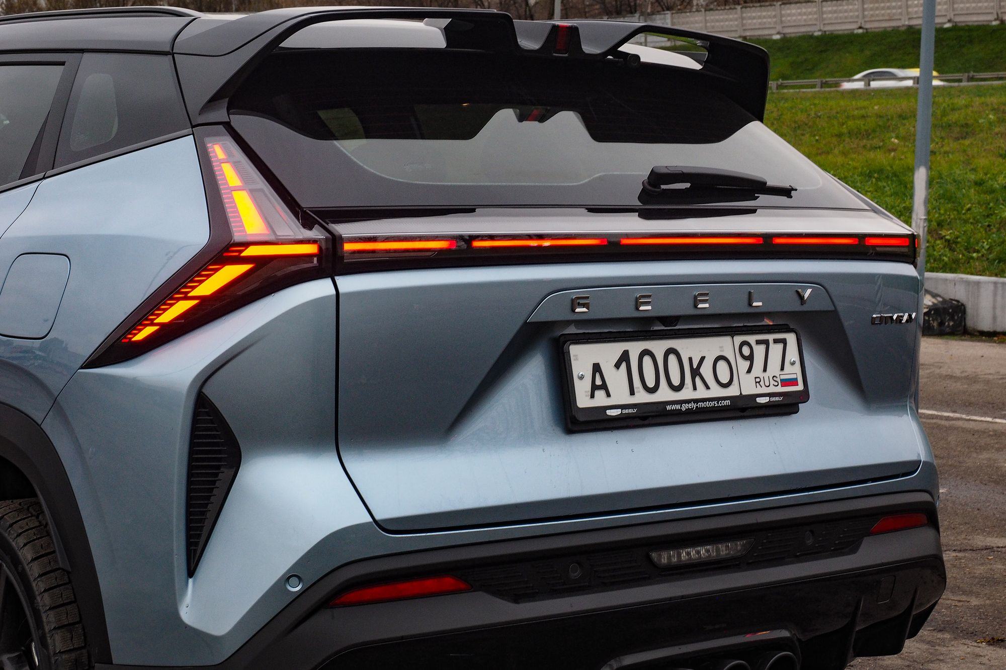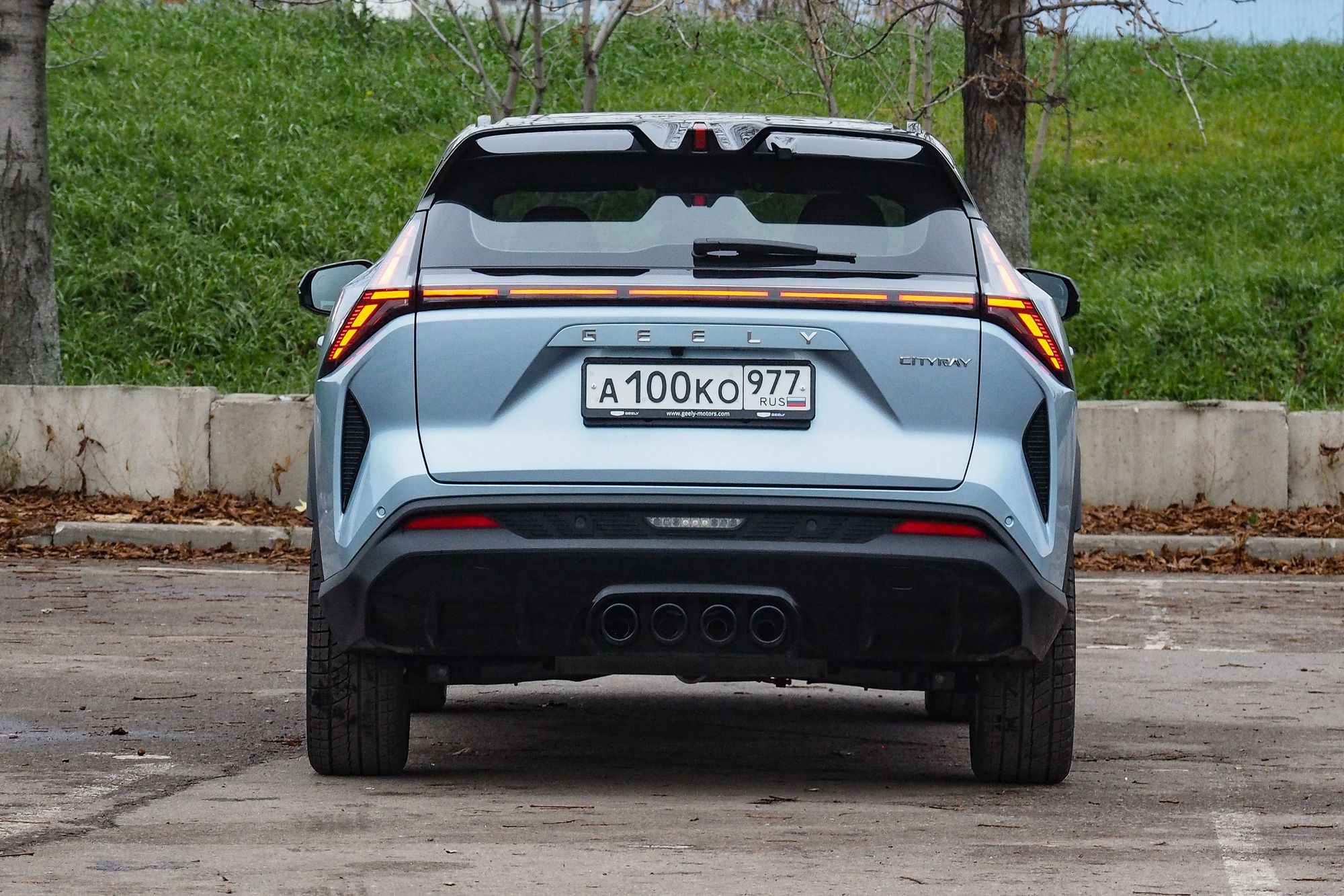 Но, с другой стороны, дизайнеры Geely явно отказались от части наследия Питера Хорбери – и от характерного изгиба задней части подоконной линии в виде своеобразного плавника, и от пятиугольной облицовки радиатора, повторяющей в своей форме эмблему марки. Не скажу, что нынешний дизайн с решеткой в виде перевернутой трапеции выглядит как-то не так, а уж сзади Cityray в топовой комплектации и вовсе бьет наотмашь эффектными деталями: диффузором и четырьмя законцовками выхлопной системы, собранными в единый пакет по центру – таким в свое время впечатлял Corvette C7. И вот представьте себе: катит перед вами такой автомобиль, дразнит тем самым диффузором и хитрым дефлектором с крупным повторителем стоп-сигнала в центре, как у болидов F1, целится в вас счетверенной крупнокалиберной выхлопной установкой… Так и хочется предположить, что вы видите корму этакого дорожного монстра, а не скромный семейный кроссовер. Вот только новый дизайн передней части, выполненный в полном соответствии с модными тенденциями, разом лишил марку какой-то части индивидуальности, поставив в одну шеренгу с Changan, Omoda и Jetour.