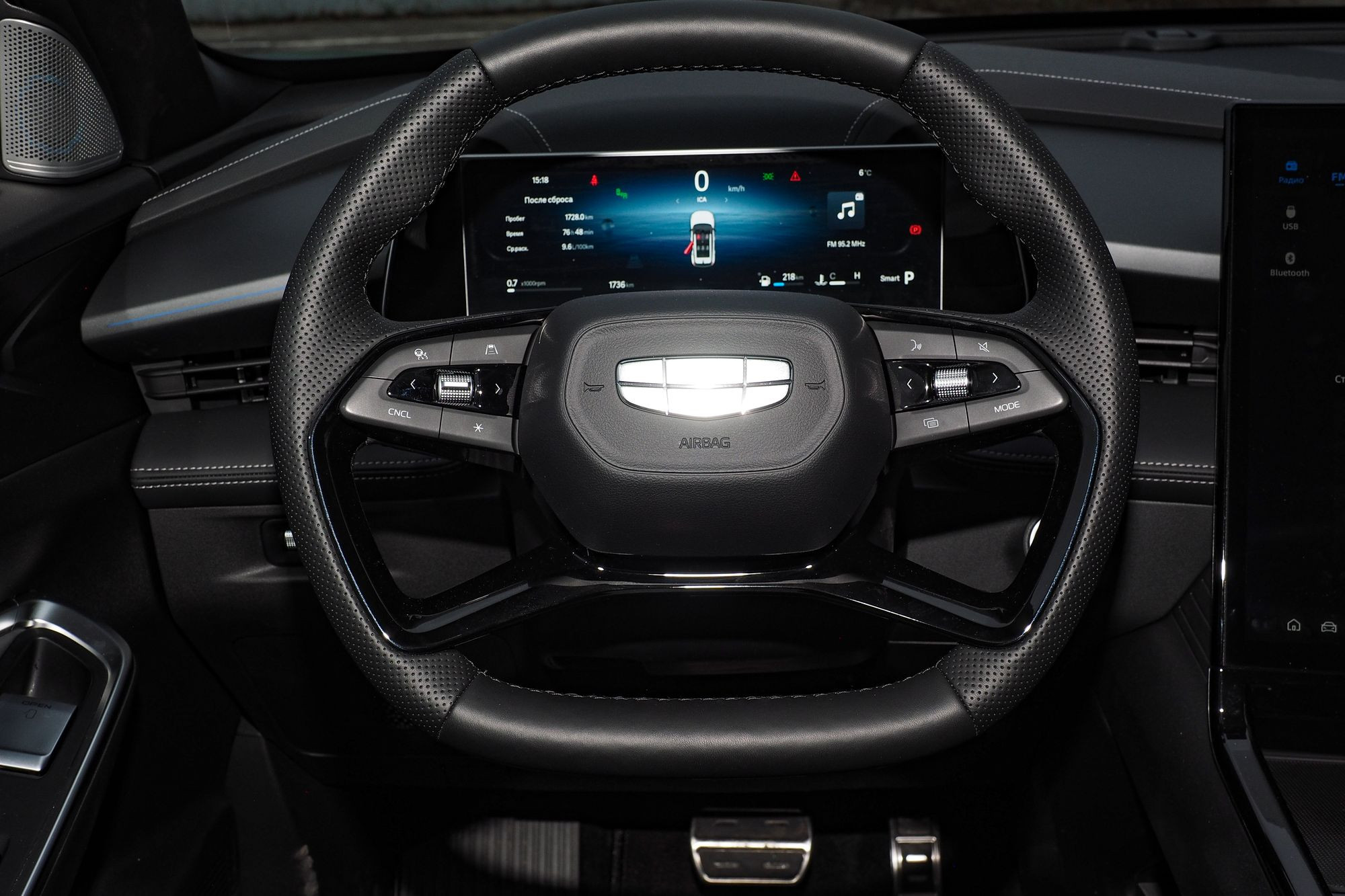 Еще один элемент интерьера, который притягивает взгляд, это сплюснутый руль со срезанными верхним и нижним сегментом. Впервые с такой конструкцией я столкнулся в Peugeot 5008, но там это решение было вполне оправданным конструктивно: панель приборов расположена выше руля, и водителю полагается смотреть на нее поверх баранки. В Geely Cityray на приборный дисплей смотришь традиционным образом, через обод, так что «сплюснули» руль сугубо в угоду моде. Забегая вперед, скажу, что привыкнуть к этому все-таки можно. На скоростных трассах, там, где даже в быстрых поворотах не нужно поворачивать руль на большой угол, все вполне удобно, тем более что рулевое управление Cityray очень острое и точное. Но в ситуациях, когда нужно быстро крутить руль «от упора до упора», я однозначно испытывал неудобство. Но вернемся к дисплеям и другим органам управления.