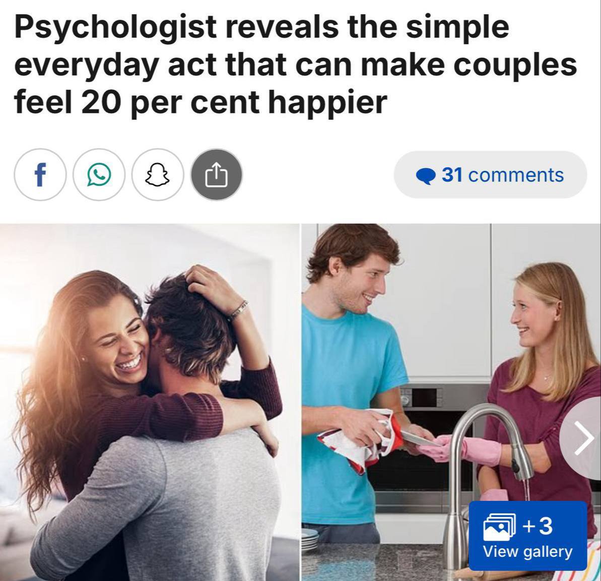 По словам психологов, совместное мытьё посуды идёт на пользу парам и повышает уровень их счастья на 20%. Всё из-за того, что когда вы в отношениях вместе решаете бытовые задачи, создаётся чувство справедливости, поддержки и уважения. В результате вы учитесь больше доверять друг другу и полагаться на взаимную помощь.