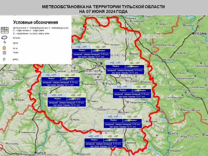 "Переменная облачность, кратковременный дождь (по данным сайта Гидрометцентра России - 2 мм), местами гроза. Ветер западный, северо-западный 5-10 м/с, при грозе порывы 12-17 м/с. Температура воздуха ночью +12…+17°С, днем +22…+27°С. Атмосферное давление 740-745 мм рт.", - говорится в официальном сообщении ЦУКС ГУ МЧС России по Тульской области.