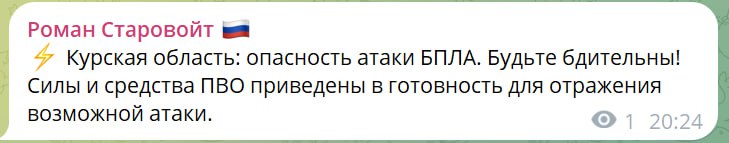 Власти Курской области сообщают об угрозе атаки вражеских БПЛА