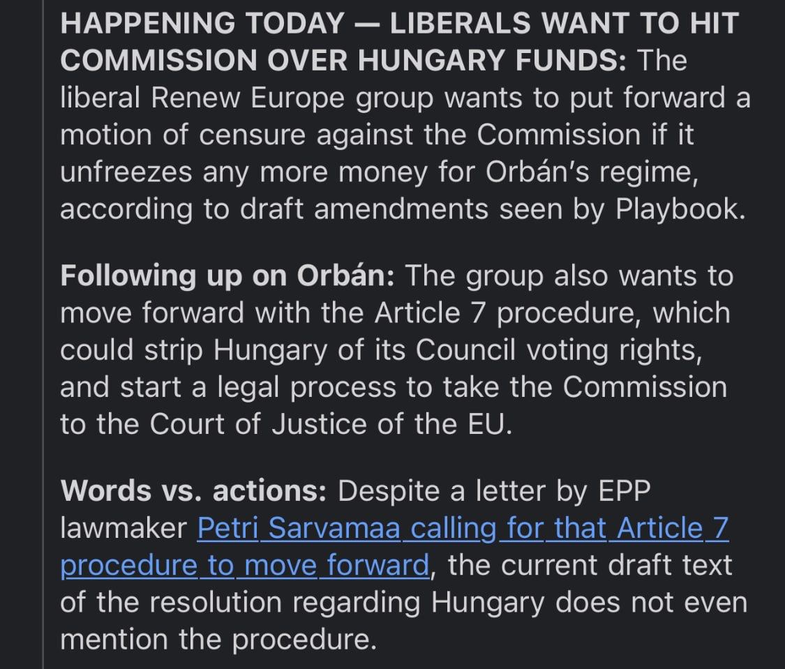 🤔Теперь же блок «Обнови Европу» недоволен тем, что не удалось превратить Венгрию в бесправного члена ЕС. Возможно, это повлечет за собой последствия для главы Еврокомиссии Урсулы фон дер Ляйен, которая пошла (или пойдет) на условия Орбана и выделит не 30 и даже не 50, а все 80 млрд для удовлетворения аппетитов Орбана и Зеленского.