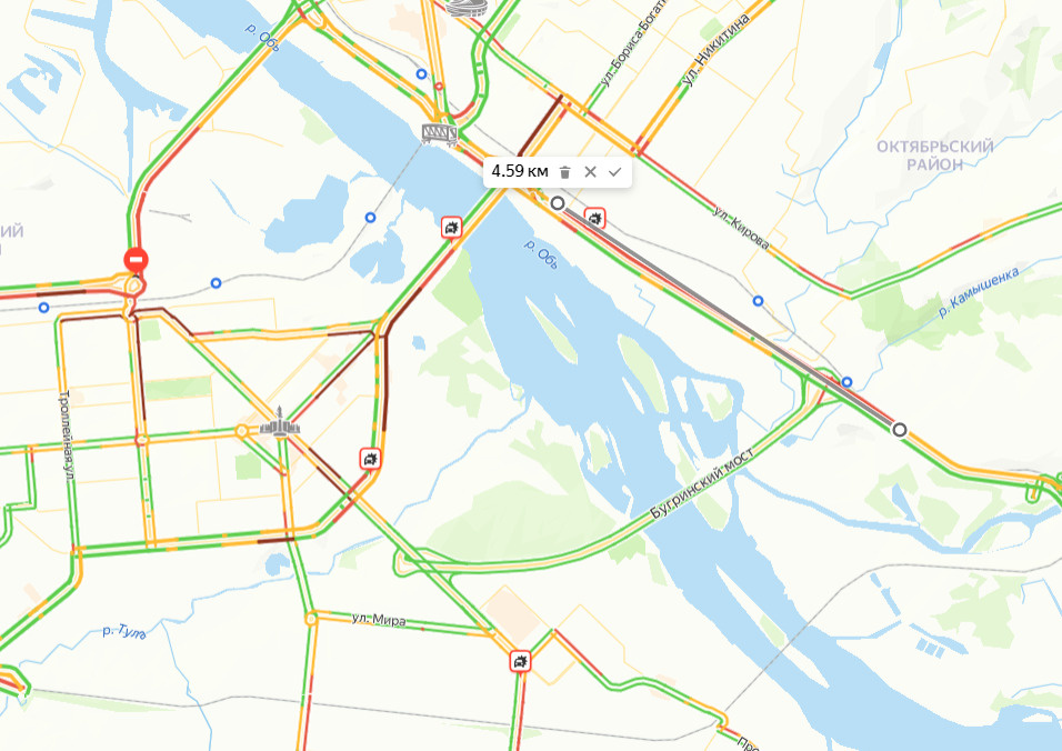 Утром 4 декабря центр Новосибирска и часть левобережья сковали пробки. Сервис 2ГИС оценивает дорожную ситуацию на 09:00 в 8 баллов, «Яндекс.Пробки» — в 7 баллов.