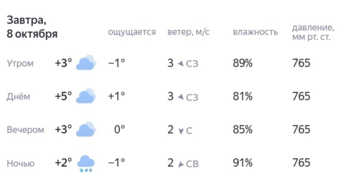 В среду, 8 октября, средняя температура в Югре составит от +5 до +10 градусов днем, и от -2 до +3 градусов ночью. В восточной части обещают похолодание: в дневное время до -3…+2 градусов, в ночное — до -4…+1 градуса. Также прогнозируют снег с дождем и туманы. Ветер — юго-западный с переходом в северо-западный, 1-6 м/с.