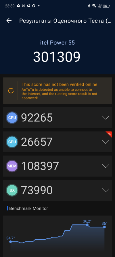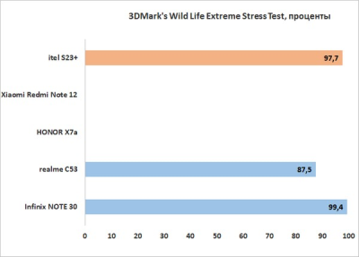 Зато у itel S23+ нет никаких проблем с охлаждением. Низкое тепловыделение — еще одно достоинство Unisoc T616: ресурсные тесты не фиксируют понижения частот. Но есть нюанс – к примеру, цикл Wild Life Extreme Stress Test смартфон смог завершить не с первой попытки, процессору пришлось тяжеловато.
