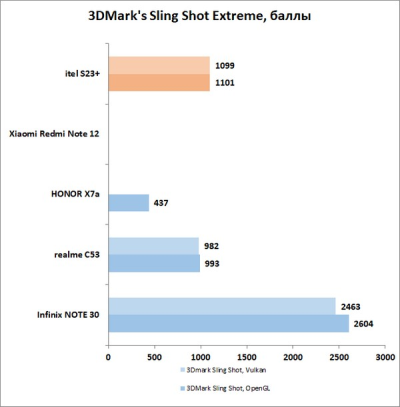 Как можно увидеть по сравнительным графикам производительности, itel S23+ держится вполне бодрячком на фоне конкурентов, по большей части вровень с платформами MediaTek (Qualcomm в ценовую категорию около 15 тысяч рублей не завезли). А realme C53, к примеру, оснащен даже младшей версией упомянутой платформы – Tiger T612. Да, система работает небыстро, но приложения запускаются любые, в том числе и игры. Правда, графические настройки придется подрезать — и не рассчитывать на предельную кадровую частоту. Но никакого кошмара, нормальный средний уровень.