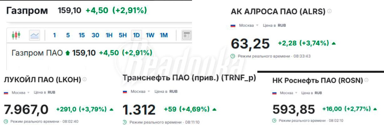 Индекс IMOEX2 (все сессии) этим утром обновил максимум с мая 2024 года, превысив 3292 пункта (+ 8,31%) — спрос инвесторов резко повысился после телефонного разговора Путина и Трампа, в котором лидеры стран обсудили возможность начала переговорного процесса по украинскому конфликту. По данным финансового портала Investing, в лидеры роста вырвались акции «Транснефти» (+4,69%), «Газпрома» (+4,50%), «АЛРОСА» (+3,74%), «Роснефти» (+2,77%) и «Лукойла» (+3,79%).