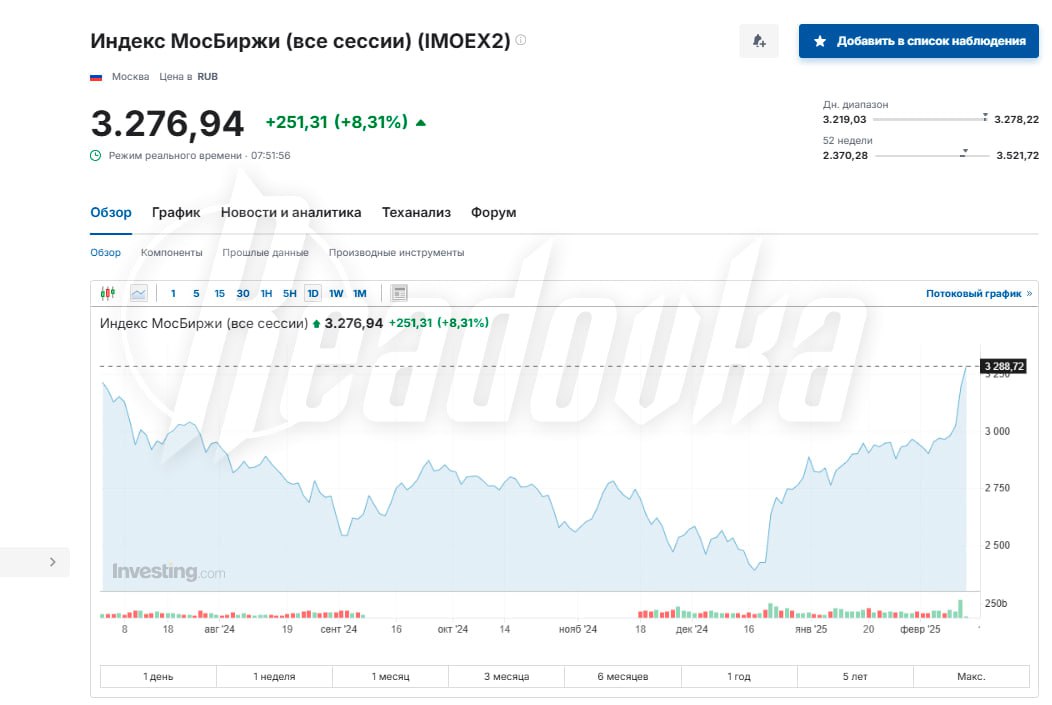 После разговора Путина с Трампом индекс МосБиржи прибавил более 8% — акции российских компаний рванули вверх