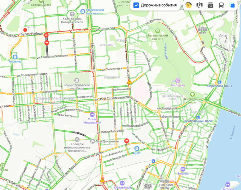 3,8-километровая пробка сковала Московский проспект в Воронеже сегодня утром, 19 сентября, если верить данным сервиса «Яндекс карты».