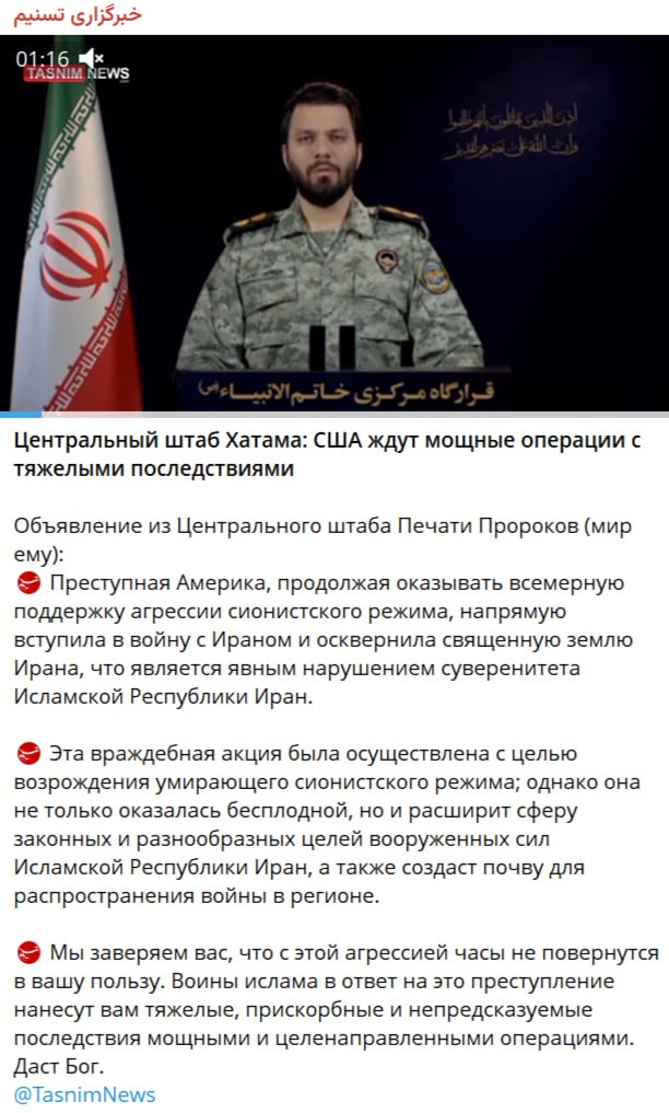 Представитель объединённого штаба боевого командования Вооружённых сил Ирана, пообещал «мощные и целенаправленные операции» с «тяжелыми последствиями» против США за их атаку на Иран.