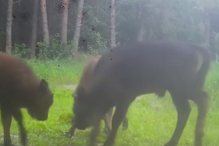 На кадрах, снятых фотоловушкой, видно, как молодые зубры резвятся и устраивают дружеские поединки.