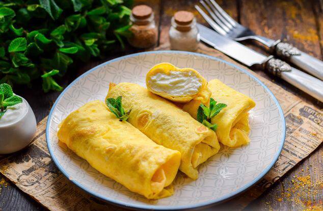 5. На край блина выложите несколько ложек готовой творожной начинки.