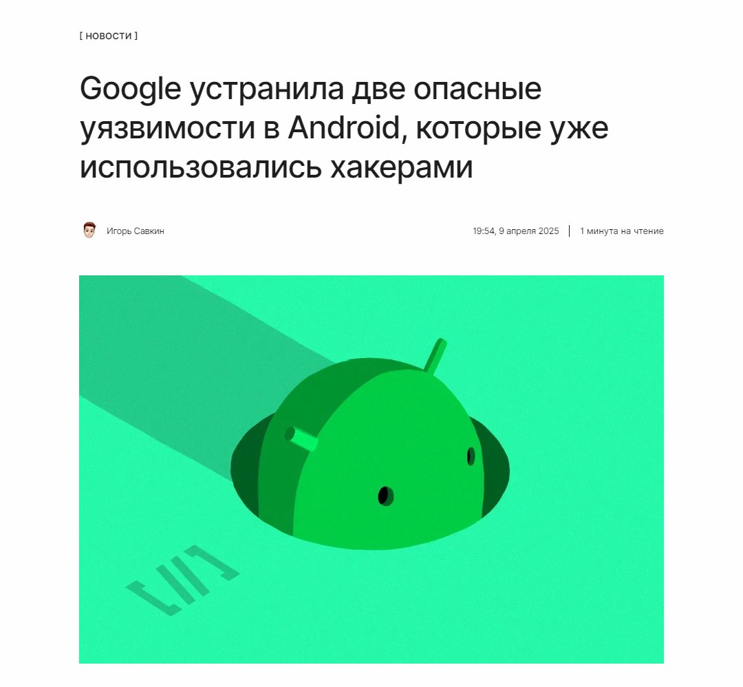 Google выпустила экстренное обновление безопасности для Android, устраняющее две уязвимости нулевого дня. Одна из уязвимостей активно использовалась, и пользователи могли даже не подозревать о взломе.