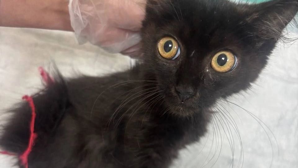Малыш травмирован, на спине — порезы, хвост сломан. Сейчас котенок находится в клинике, где ему оказывают помощь.