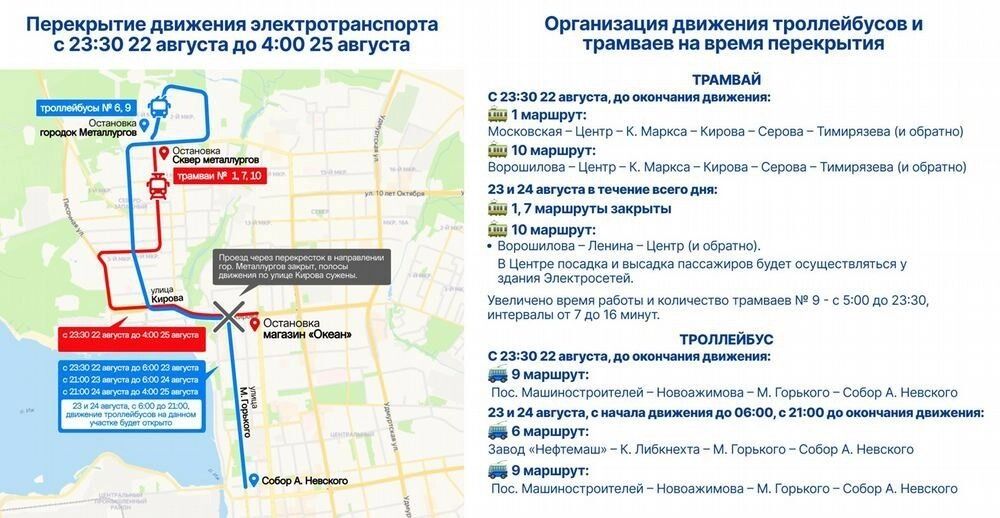 С 23:30 22 августа до 4:00 25 августа проезд через перекресток улиц Максима Горького и Кирова в направлении городка Металлургов будет закрыт. Также для проезда будут сужены полосы движения по улице Кирова в обоих направлениях.