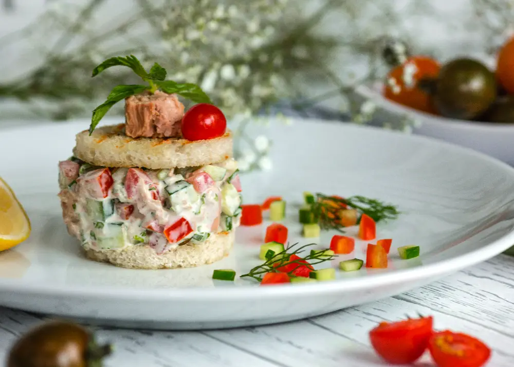 Исключите мясные ингредиенты и добавьте свежий авокадо или тофу. Вместо майонеза можно использовать натуральный йогурт.