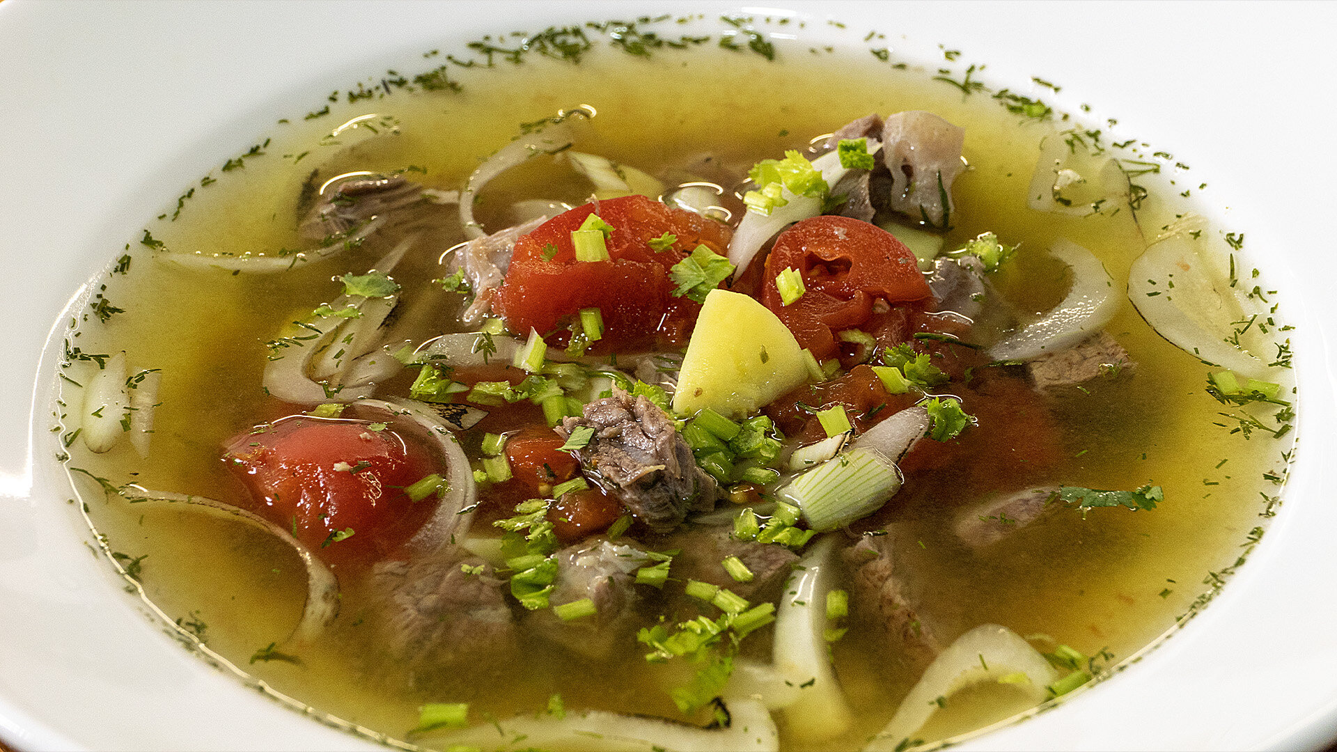 Газовой горелкой обжигаем мясо и половинку луковицы. В кастрюлю с водой отправляем голяшку, лук, зубчик чеснока и пару листов лаврушки. По вкусу солим и варим до готовности мяса. Сваренное мясо режем на небольшие кусочки и такими же кусочками нарезаем вареный картофель. Добавляем в кастрюлю аджику, нарезанные и очищенные от кожицы маринованные томаты. Забрасываем в бульон для аромата укроп и доводим до кипения. Перышками нарезаем оставшуюся половинку луковицы и обжигаем газовой горелкой. В закипевший суп отправляем обожжённый лук и мелко нарезанный зубчик чеснока. Суп готов! Разливаем по тарелкам, посыпаем любимой зеленью и наслаждаемся вкусом, поправляя здоровье. Приятного всем аппетита и легких похмелий!