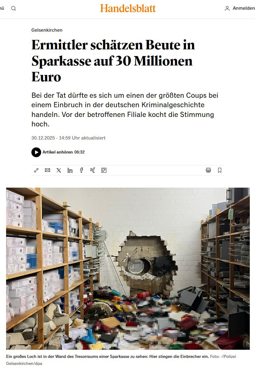 «При взломе хранилища отделения Sparkasse в Гельзенкирхене преступники, по первой оценке следователей, похитили около 30 миллионов евро. Были вскрыты 3 200 банковских ячеек, пострадали более 2 500 клиентов», — сообщили источники в силовых структурах.