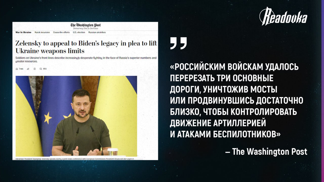 Несмотря на то, что Покровск все еще находится под контролем ВСУ, уже сейчас можно говорить о том, что город потерян для незалежной как логистический узел, заявил украинский командир танкового подразделения 68-й бригады «Физик» газете The Washington Post. ВС РФ успешно перерезали 3 ключевые дороги и мосты в этом районе.