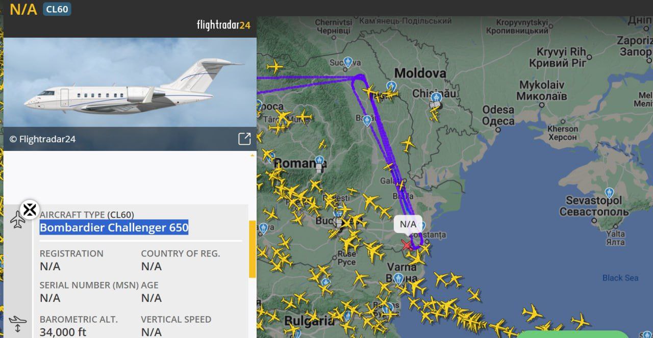 Над берегами Румынии, "простреливая" акваторию Черного моря, работает натовский Bombardier Challenger 650, переоборудованный под проведение радиоэлектронной разведки, сообщает @voenkorKotenok