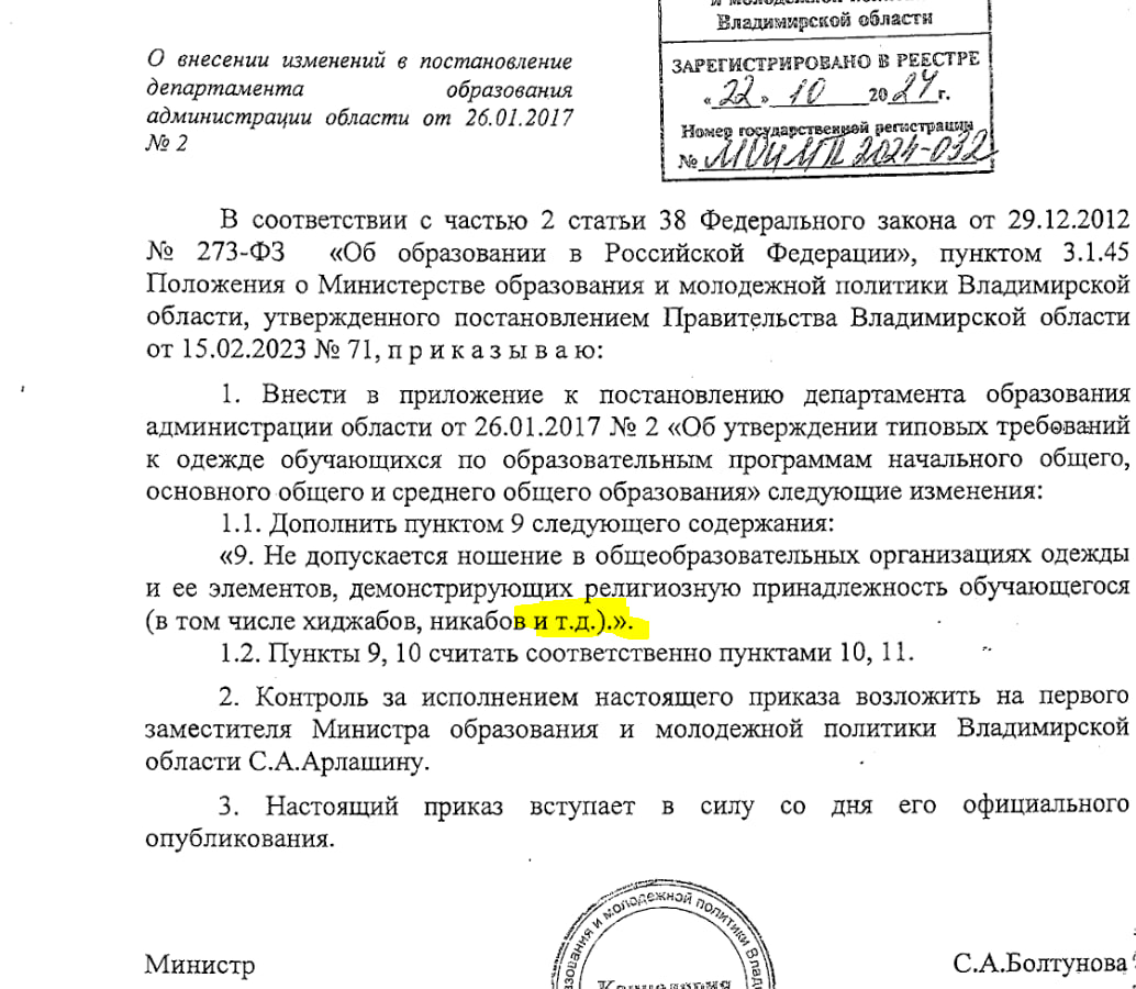 По поводу происшедшего во Владимире, где региональные власти запретили ношение религиозной одежды в школе. Не надо раздувать из этого мифическую исламофобию, которой там нет. Приказ издан исключительно в рамках конституционных полномочий субъекта федерации, а отделение церкви от государства, равно как и светский характер общеобразовательной учебной программы, является ценностью, гарантированной нам Конституцией. Нарушение которого больше вредит даже не государству или обществу, а любой религии, которая после этого становится не устойчивой личной связью с инобытием, а всего лишь формой идеологии, которая сегодня есть, а завтра исчезла. Отдельно стоит отметить, что в документе отмечено, что речь идет о ЛЮБОЙ религиозной одежде, а не только о никабах.