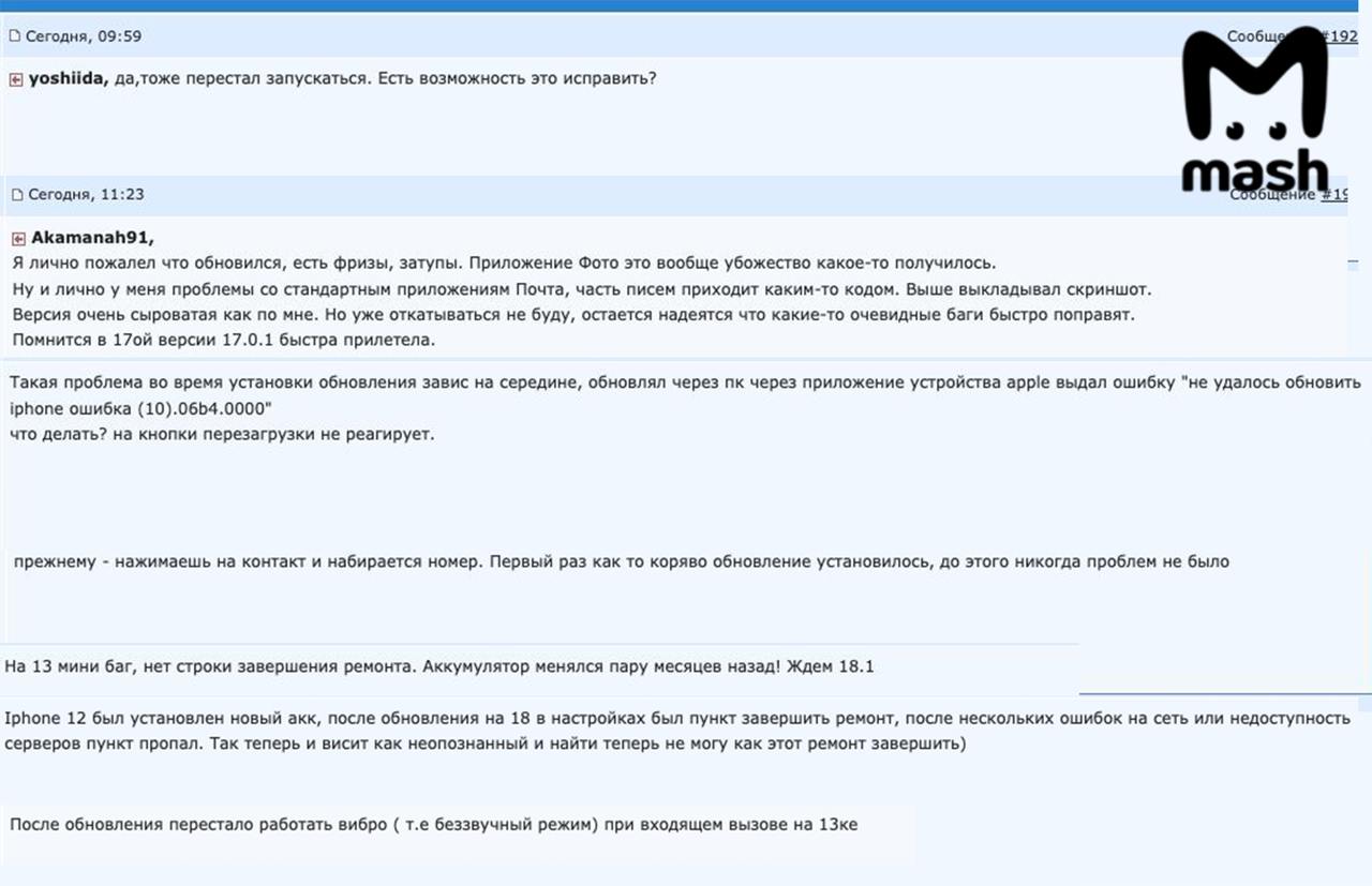 Как рассказали Mash сотрудники ремцентров, число заявок на починку смартфонов с момента первого обращения увеличилось до 20 всего за час. Оказалось, самые лютые проблемы у владельцев моделей с новыми запчастями. Например, заменёнными аккумуляторами. После обновления ПО они перенагреваются и перестают нормально функционировать. Подобные проблемы и у тех, кто до установки iOS 18 заменил дисплей.