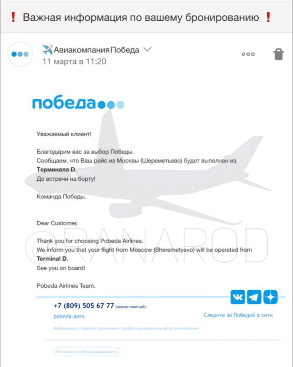 ✈️❗️ «Победа» начала уведомлять пассажиров о вылетах из Терминала D аэропорта Шереметьево. Такое письмо получил читатель @dearpassengers, вылетающий в Чебоксары в октябре.
