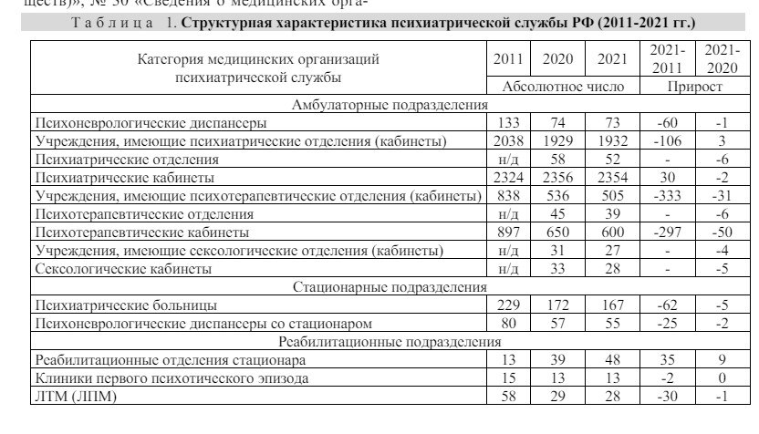 Не то что по сравнению со временем СССР, но даже по сравнению с 2011 годом из таблицы видно, как сильно уменьшилось число различных психиатрических подразделений.