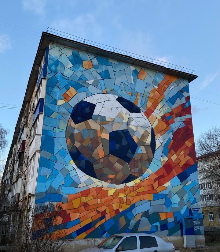 В Кургане уличные художники Данил Козик и Алёна Федкович завершили рисунок футбольного мяча на фасаде дома № 15 на улице Невежина. Арт-объект они стилизовали под мозаику, сообщает пресс-служба администрации города.