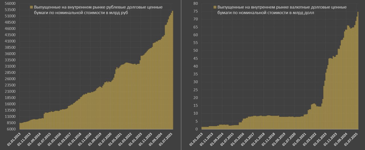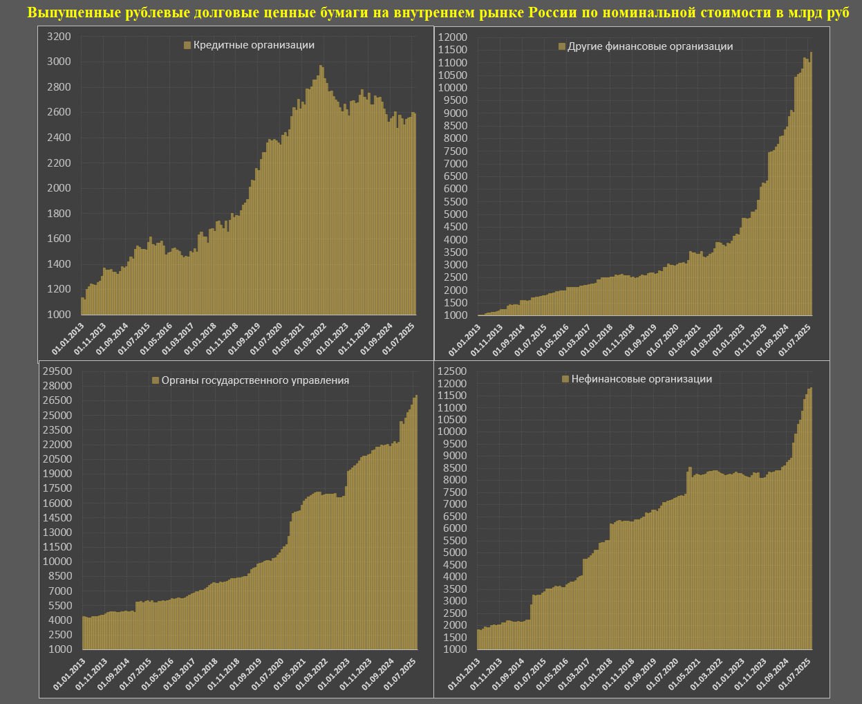 В структуре прироста задолженности за 7м25: государство – 2.75 трлн vs 0.36 трлн годом ранее, нефинансовые компании – 1.9 трлн vs 0.25 трлн, другие финансовые организации – 1 трлн vs 0.9 трлн, кредитные организации – около нуля vs сокращения на 0.13 трлн.