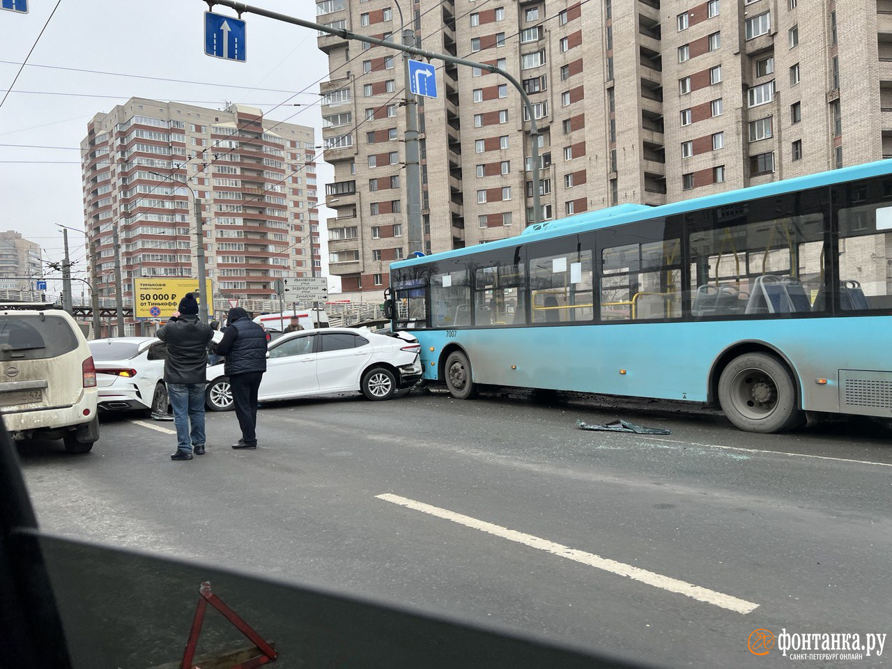 Массовая авария с участием автобуса произошла днем 28 февраля во Фрунзенском районе Петербурга. Побитые машины растопырились зигзагом, перекрыв почти всю проезжую часть.