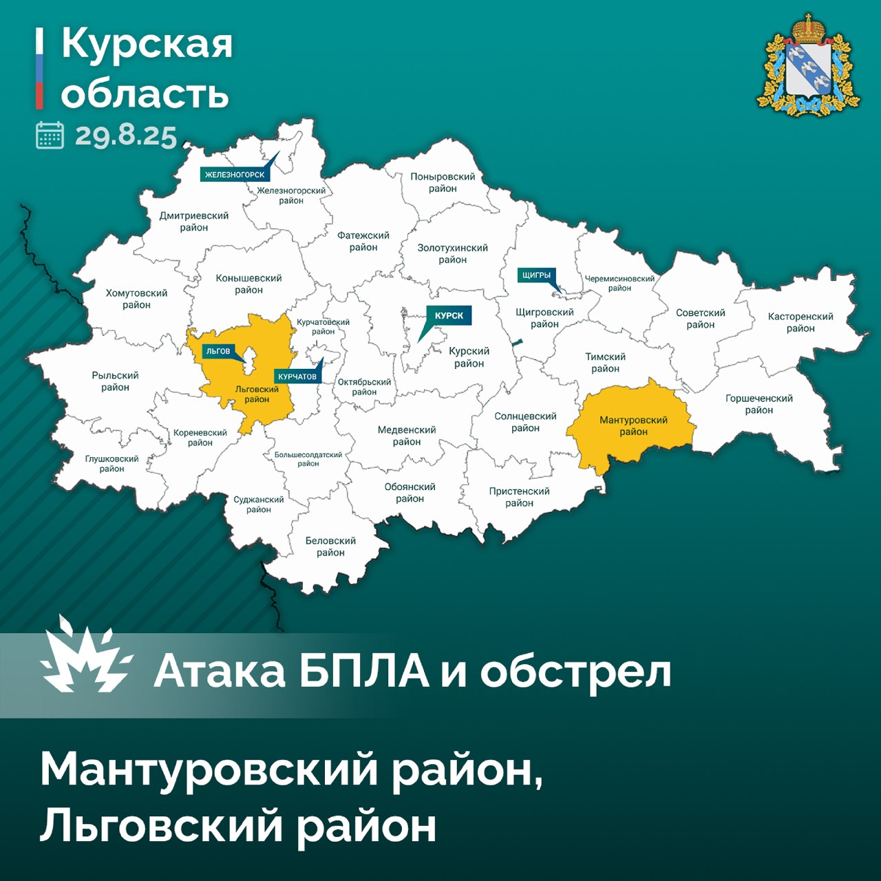 Кроме того, в ночь на то же число ВСУ обстреляли село Густомой Льговского района. В результате нападения были повреждены окна и фасады школы, отделения почты, местного дома культуры и одного частного дома. Также получил повреждения автомобиль. К счастью, в обоих инцидентах никто не пострадал.