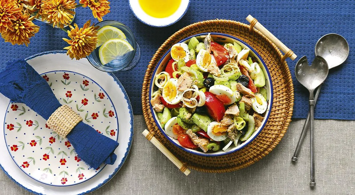 Этот салат из консервированного лосося немного напоминает французский нисуаз: хрустящие салатные листья, свежие овощи, консервированная рыба (лосось вместо тунца), отварные яйца, маслины и каперсы с легкой заправкой на основе лимонного сока и оливкового масла. Есть и отличия: в традиционный нисуаз не добавляют огурец, зато почти всегда кладут бланшированную стручковую фасоль и анчоусы. Безусловно, и вы можете экспериментировать с составом такого салата, заменяя маслины и каперсы на другие маринованные овощи, например, огурчики-корнишоны или жемчужный лук, а также выбирая рыбу и свежие овощи по своему вкусу.