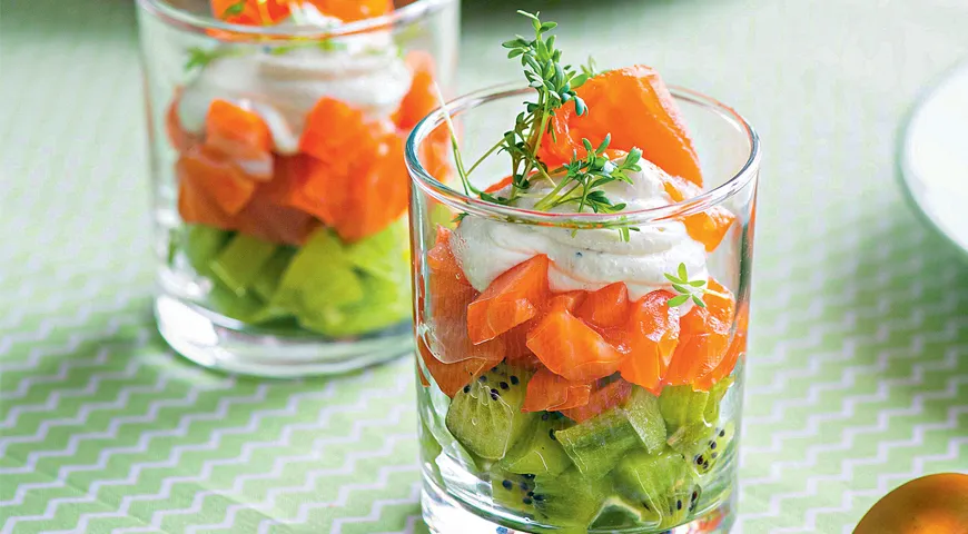 - Распределите киви по четырем стаканчикам. Разложите лосося и добавьте сырный соус. Украсьте зеленью.