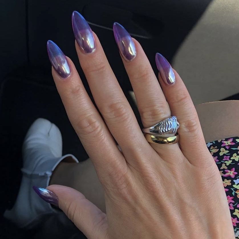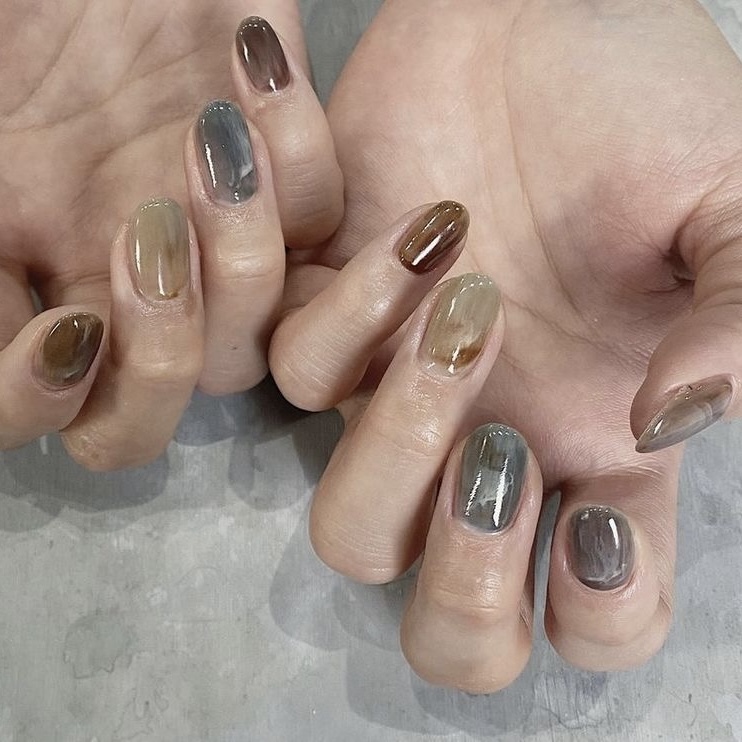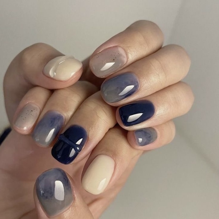 Особенность такого маникюра – оттенки. Бибер выбрала темно-синий, но можно остановиться на сером, фиолетовом или бордовом. Главное – отойти от розовой палитры и попробовать холодные и «зимние» цвета. А покрытие сделать полупрозрачным, чтобы создать тот самый желейный эффект.