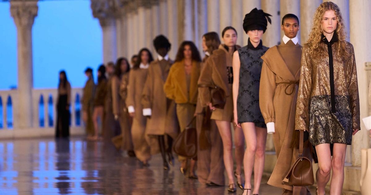 Ce mardi soir, entre chien et loup, une aventurière des temps modernes, drapée dans un étrange manteau cape d'un blanc lumineux, s'avance dans la majestueuse loggia du Palais des Doges, éclairée par la lumière si particulière de la Sérénissime. Sa chevelure d'un blond vénitien dessine des boucles dans le vent, sa démarche semble affirmée dans ses ballerines à bouts pointus... Dans son sillage, autant de femmes puissantes se succèdent vêtues de longs chemisiers à manches gigot en brocart de soie imprimé d'arabesques, de peignoirs de taffetas aubergine comme des manteaux d'opéra, ou encore, de manteaux de cachemire ceinturés d'un cordon de passementerie. Un trench dont le col et les poignets officier sont amovibles, reprend l'art de la mosaïque vénitienne dans un incroyable jacquard de fils or et ocre : il a été réalisé par les artisans de Max Mara Atelier, l'équivalent de la haute couture. Des robes de cachemire double face, simples comme des toges monastiques, sont bijoutées de longs sautoirs ornés de pierreries de couleurs que ne renierait pas la plus chic des sciuras milanaises. Si les silhouettes font référence l'opulence de la cité des Doges, elles esquivent l'écueil du costume historique. Certaines évoquent surtout le power dressing minimaliste d'Anne Marie Beretta, l'immense créatrice des années 1980 qui a inventé le fameux camel coat, encore aujourd'hui best-seller de Max Mara.
