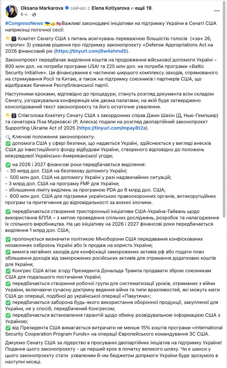 Также Маркарова пишет, что в комитете иностранных дел представили двухпартийный законопроект, которым предлагается выделить Украине в 2026 и 2027 годах 30 млрд долл. на прямую военную помощь, 500 млн на случай чрезвычайных ситуаций, 600 млн на правоохранительные органы, антикоррупционные программы и привлечение к ответственности за военные преступления.
