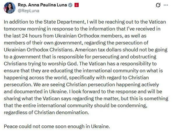 Конгрессвумен США Анна Паулина Луна заявила, что планирует направить обращение в Ватикан в связи с, по её словам, преследованием Украинской православной церкви.