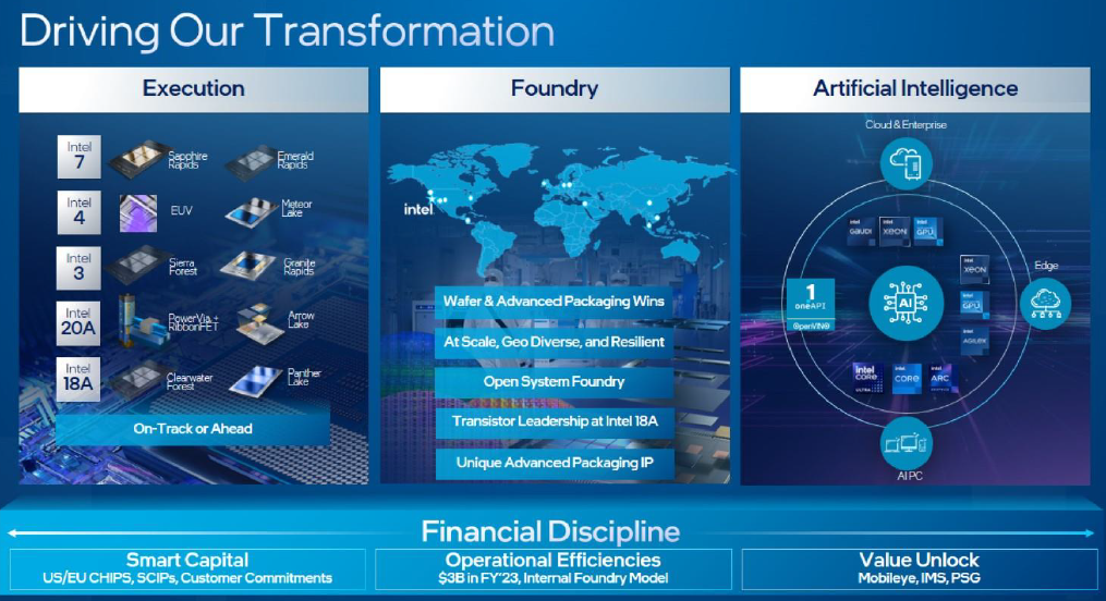 Руководство Intel напомнило, что 14 декабря текущего года собирается представить клиентские процессоры Meteor Lake и серверные Emerald Rapids. Освоение пяти новых техпроцессов за четыре года становится всё более реальным, и многие решающие этапы реализации этой амбициозной программы уже пройдены, поскольку она стартовала два с половиной года назад. Компания в совокупности уже выпустила 150 млн компонентов, произведённых с использованием технологии Intel 7. Процессоры Alder Lake, Raptor Lake и Sapphire Rapids уже присутствуют на рынке, поставки Emerald Rapids начались на этой неделе. В минувшем квартале Intel отгрузила миллионный экземпляр Sapphire Rapids и в следующем месяце собирается выпустить двухмиллионный.