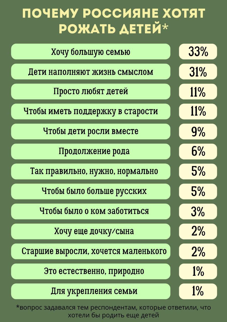 ❓Кстати, на вопрос «Почему россияне не хотят рожать детей?» большинство респондентов назвали основной причиной «бедность и нехватку денег (62%)». Реже упоминаются «нестабильность и неуверенность в завтрашнем дне (21%)», «отсутствие жилья» и «другие экономические причины (16%)».