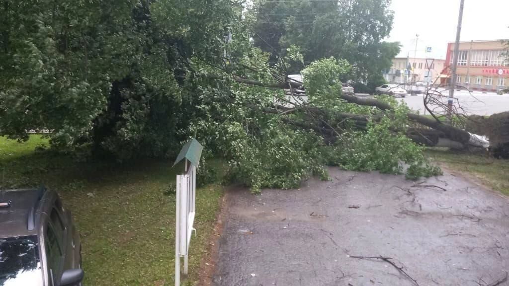 На фотографиях видно, что сильный ветер снес металлическую кровлю с крыши больницы — она упала на припаркованные рядом автомобили. Поваленные деревья перегородили дороги. Также ураганом разрушило детскую площадку.