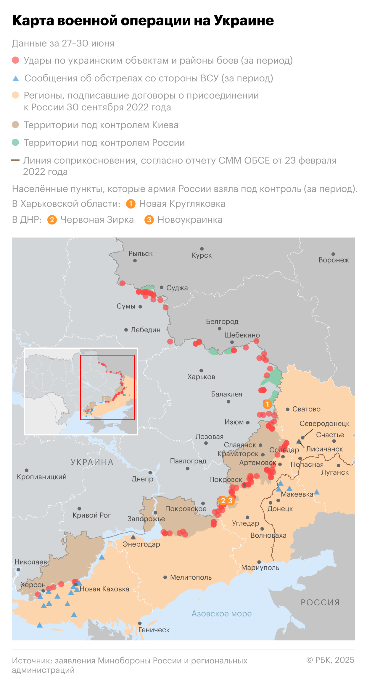 - С 21 по 27 июня Минобороны сообщило о занятии населенных пунктов Новая Кругляковка (Харьковская область), Петровское (ЛНР), Дылеевка, Новосергеевка, Запорожье, Ялта, Перебудова, Шевченко (ДНР).