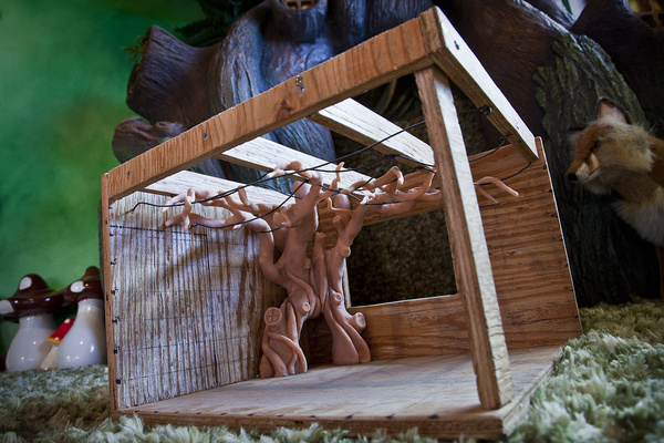 Сперва нарисовал то самое волшебное дерево. Потом сделал макет. Потом принялся за воплощение идеи в реальность: сварил каркас дерева, обтянул его сеткой, протянул внутри провода для будущей подсветки, соорудил ствол из специальной бетонной смеси, ветви из папье-маше, покрасил, повесил лампочки и украшения… В кроне есть даже птичьи гнезда — пять штук.