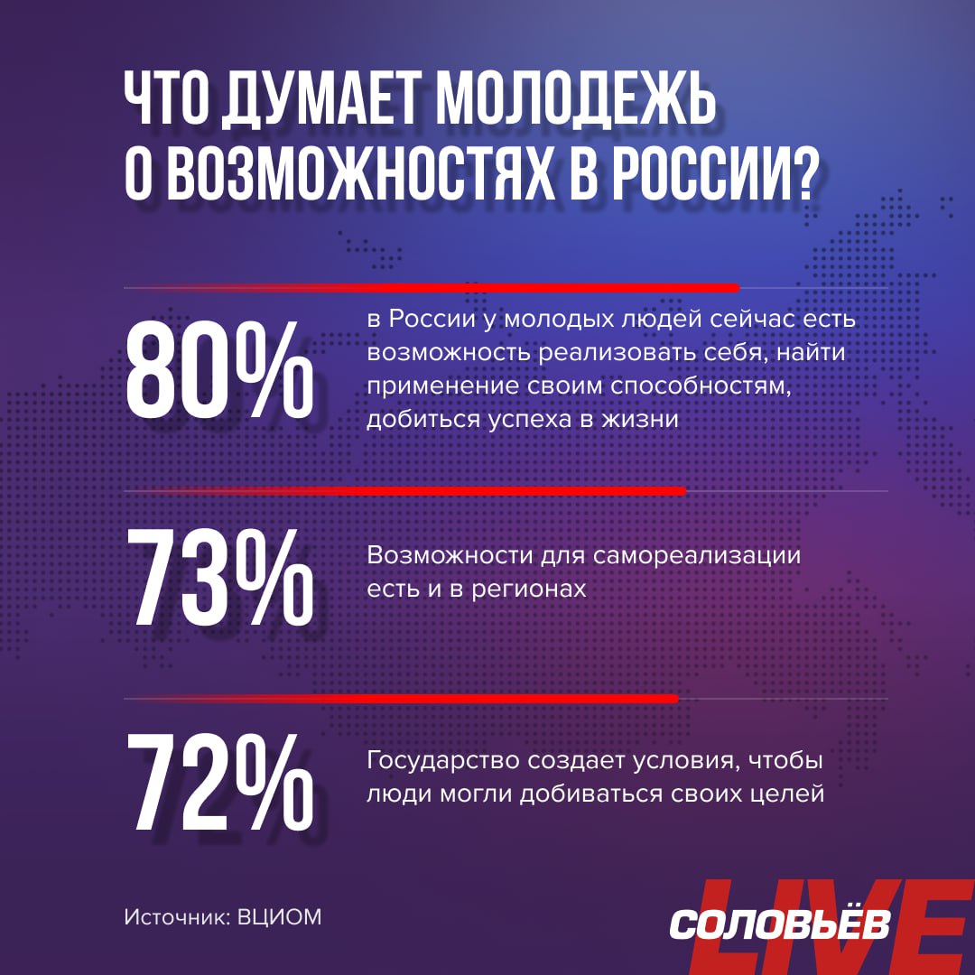 В целом в России у молодых людей сейчас есть возможность реализовать себя, найти применение своим способностям, добиться успеха в жизни — так считают 80% россиян, именно 18-35-летних россиян. Однозначно превалирует мнение, что в нашей стране у молодых людей есть возможности для достижения своих целей.