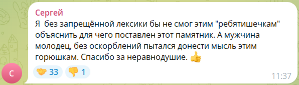 Житель города Междуреченск Кемеровской области снял на видео пляски зумеров. Несколько девушек залезли на мемориал шахтёрской славы и устроили "зажигательные" танцы.Этот монумент возвели в честь погибших горняков. И место для него выбрали не случайно: в 1992 году там трагически скончались 25 шахтёров.Ну а теперь там пляшут школьницы, их заснял случайный очевидец, сделал им замечание - и между ними произошёл следующий разговор:Это памятник скорби! Понятно?И что, теперь плакать стоять? Ну ладно, извините...Нет, извиняться будете перед всем интернетом.Мужчина выложил видео в сеть и его посмотрели в МВД:В ходе мониторинга СМИ и сети Интернет сотрудники полиции выявили размещенную в одном из Telegram-каналов видеозапись, сделанную местным жителем. Он зафиксировал, как группа подростков танцевала на мемориале шахтерской славы, который является местом памяти и скорби о шахтерах и горняках, погибших в разные годы на предприятиях города. Памятник установлен над местом, где в 1992 году в результате взрыва под землей остались погребены 25 человек, - сообщили в ведомстве.Подростков быстро нашли: это школьники в возрасте от 14 до 16 лет. С ними провели профилактическую беседу и они заявили силовикам, что "не подумали о моральной составляющей и возможных последствиях своего поведения".Правоохранители поговорили и с их родителями: тем объяснили ответственность по статье 5.35 КоАП РФ за "Неисполнение обязанностей по воспитанию". Сейчас материалы направлены в комиссию по делам несовершеннолетних, вскоре решат, ставить ли подростков на профилактический учёт или нет.