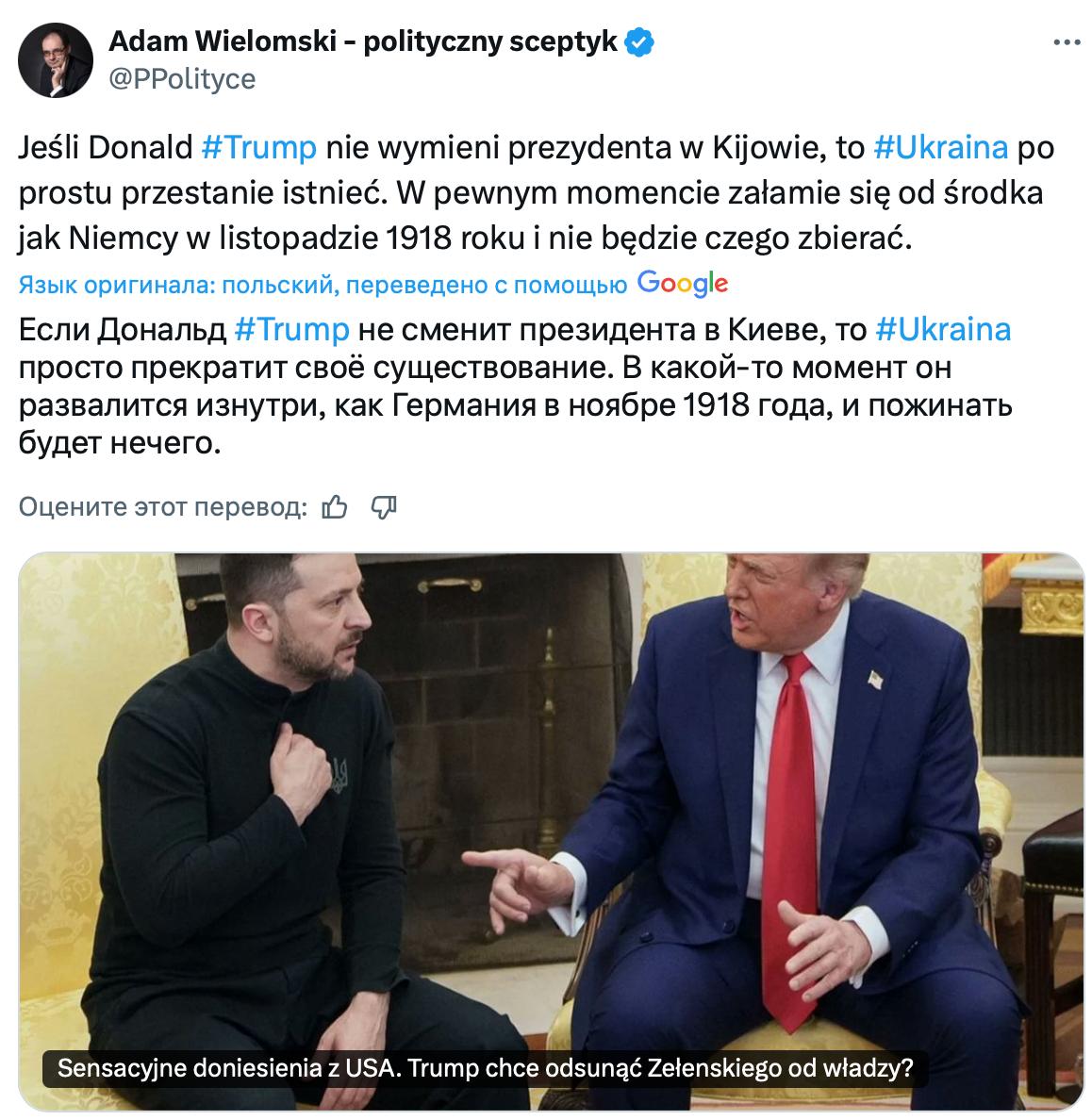 Польский политолог профессор Адам Виломский: «Если Дональд Трамп не сменит президента в Киеве, то Украина просто прекратит свое существование. В какой-то момент она развалится изнутри, как Германия в ноябре 1918 года, и собирать будет нечего».