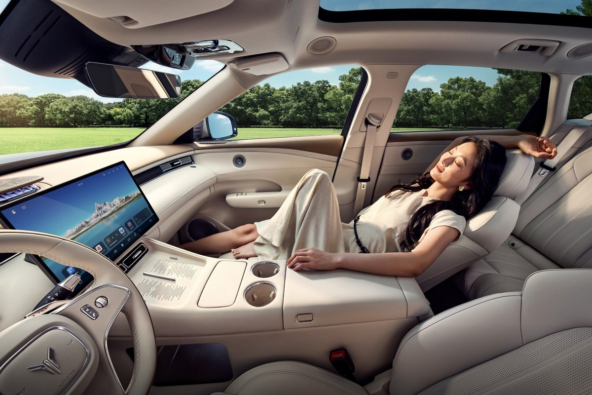 Салон полностью перекроили. Вместо подъемной передней панели с тремя экранами Voyah Free+ имеет раздельные дисплеи приборки и мультимедиа (центральный планшет – диагональю 15,6 дюйма). Электроника работает на операционной системе Harmony Space 5 той же фирмы Huawei. Еще заменили руль и карты дверей. Бокс-подлокотник теперь с единой крышкой, которая при этом открывается с двух сторон. Внутри – 7-литровый отсек с функциями охлаждения и подогрева. Переднее пассажирское сиденье может иметь подставку для ног, а у спинок задних кресел есть регулировка наклона. Сиденья – с вентиляцией, подогревом и массажером.